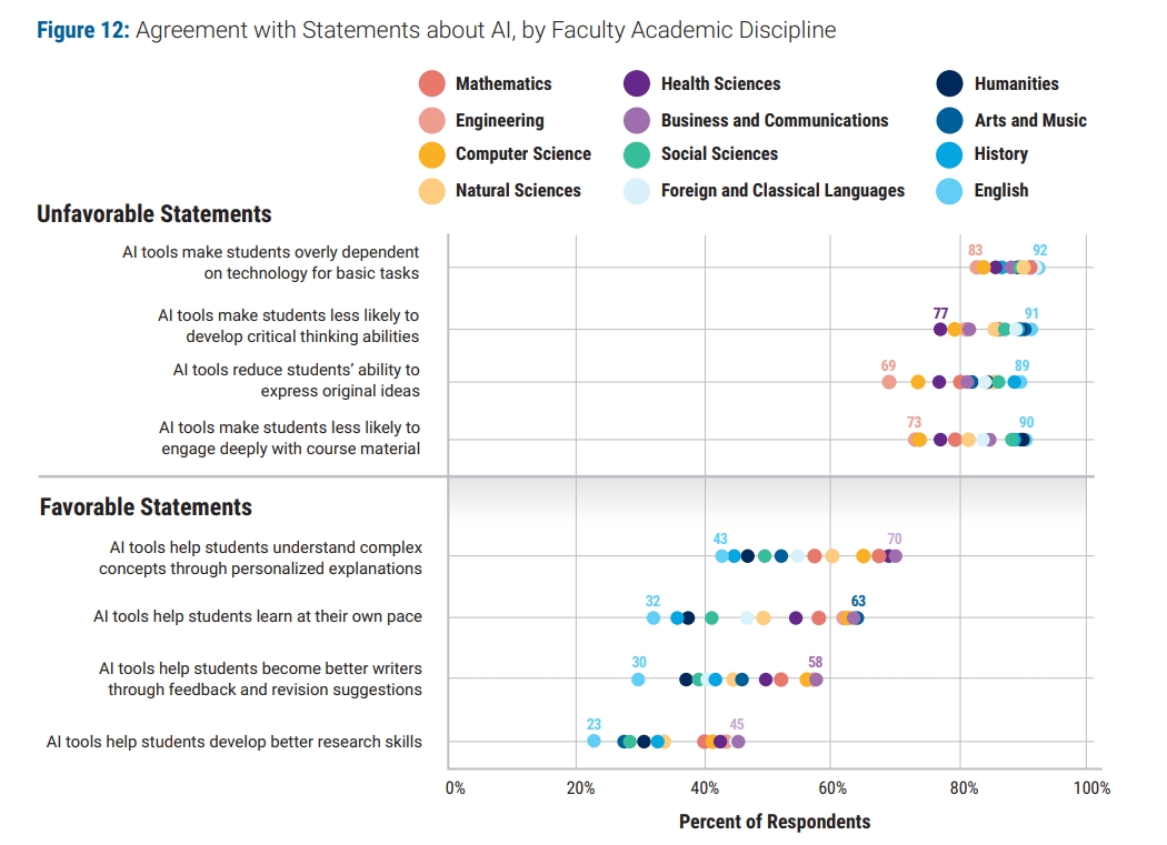 At least 84% of faculty agree that AI tools make students more dependent on technology and less likely to develop critical thinking skills, express original ideas, or engage deeply with course material.