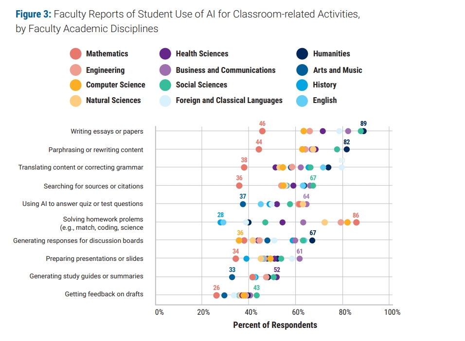 However, AI student use is not restricted to writing activities. College faculty in business and communication report student use of AI in preparing presentations, and those in mathematics and computer science report use in problem-solving activities.