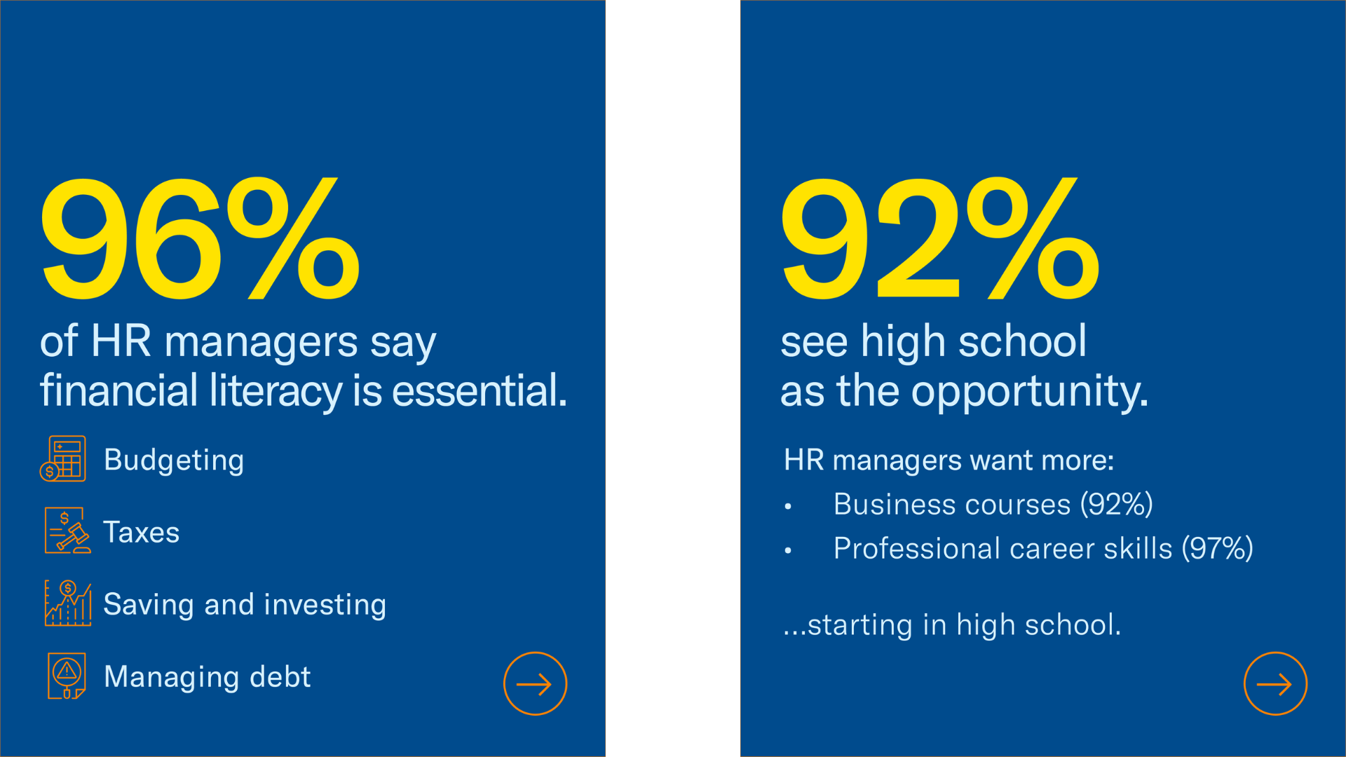 Our just released joint New Hire Readiness Report shows that 84% of hiring managers believe high school graduates aren’t ready for the workforce, even as more students choose to enter the workforce directly after high school. Hiring managers point to three areas that would make a difference: business courses, financial literacy, and professional career skills in high school. Yet only 12% of students receive formal business training in high school—a gap both evident and solvable.