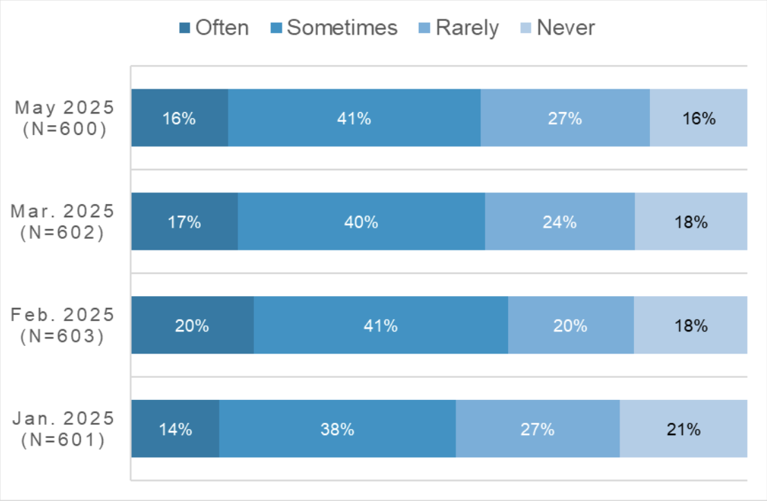 The frequency with which high school students report using GenAI tools for schoolwork, by survey administration timing
