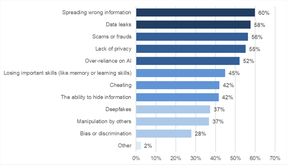 Students themselves are navigating this moment with curiosity and caution. Nearly 7 in 10 say AI is most helpful when they need information, and 85% agree it can enhance learning. At the same time, two-thirds of students say they worry that overuse of AI will make them dependent or less intelligent, and more than half express concerns about misinformation, privacy, and skill loss.