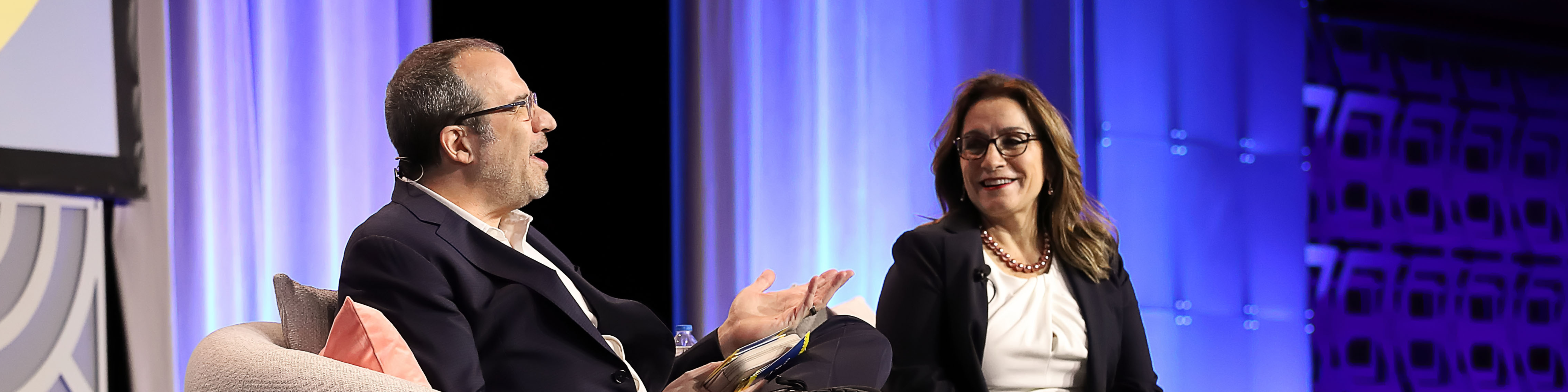 Plenary stage at Prepárate 2025. College Board CEO David Coleman (left) interviews Colorado Commissioner of Education Susana Córdova (right).